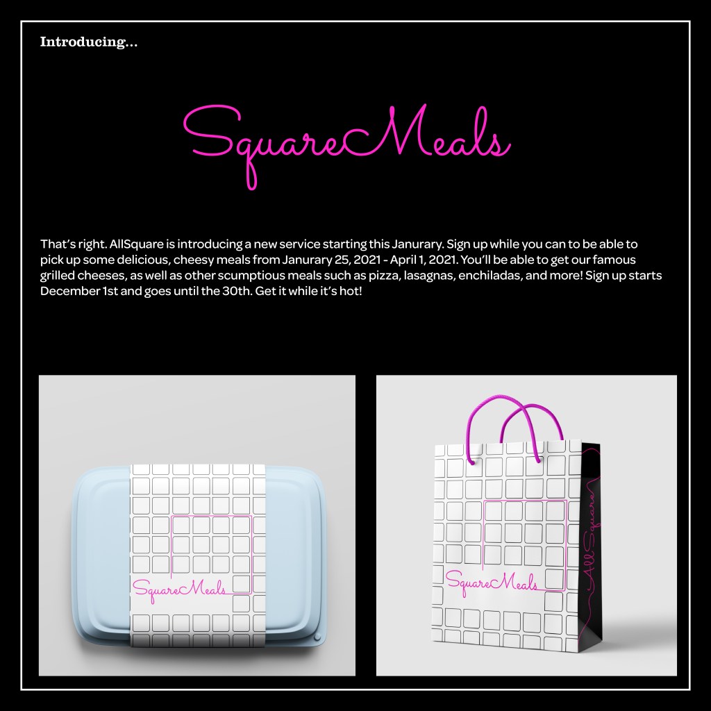 This was a project working with Minneapolis restaurant, AllSquare. They were providing a meal service to people who signed up and wanted to find a way to promote it as well as create packaging based on their already established brand design.