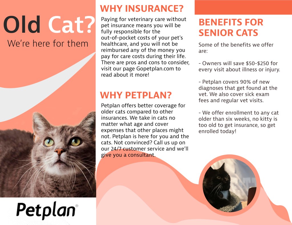 A pamphlet made for the pet insurance, PetPlan, aimed for older generations and people who own older cats. This pamphlet shows the owner all the information they need as to why they should get PetPlan for their feline friend.